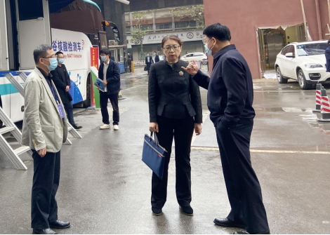 湖北省衛(wèi)生健康委醫(yī)政醫(yī)管處處長朱洪波(左一)參觀武漢光谷?核酸檢測(cè)車