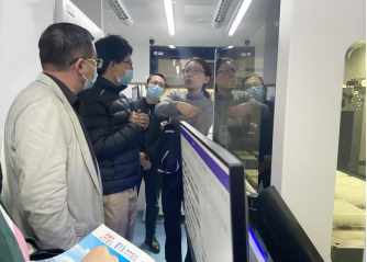 湖北省衛(wèi)生健康委醫(yī)政醫(yī)管處處長朱洪波(左一)參觀武漢光谷?核酸檢測(cè)車